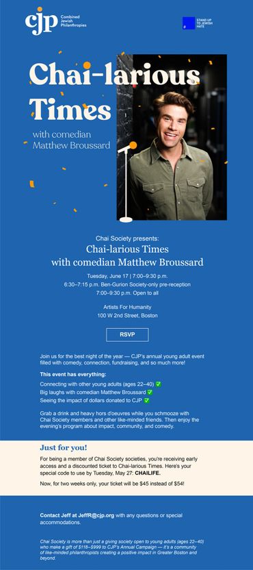 Chailarious Times is the biggest young adult event of the year — a high-energy fundraiser featuring a headline comedian and hundreds of attendees. I led the creative direction and execution across all event touchpoints, making sure the experience felt cohesive, engaging, and fun from start to finish.